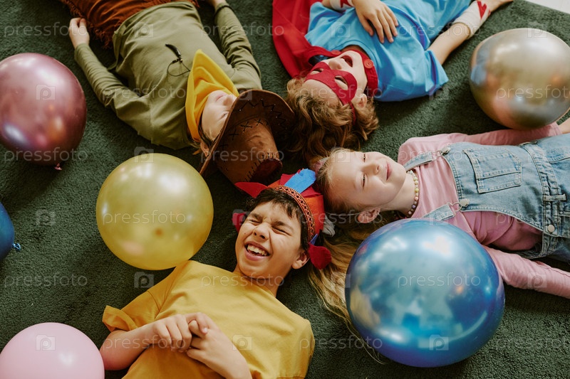 Группа разнообразных детей, лежащих на полу, смеясь и празднуя вместе