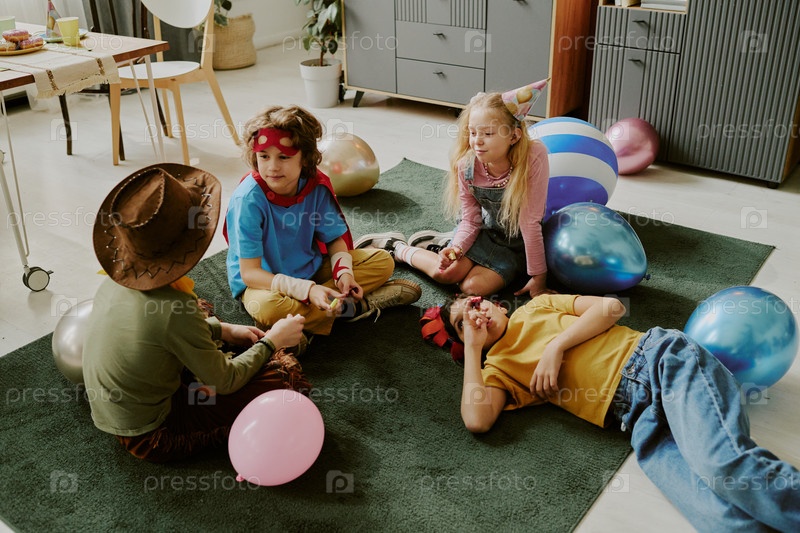 Группа разнообразных детей в костюмах, сидящих и разговаривающих во время вечеринки
