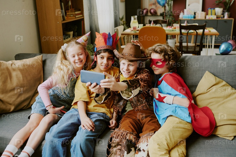 Группа разнообразных детей в костюмах, делающих селфи на диване внутри дома