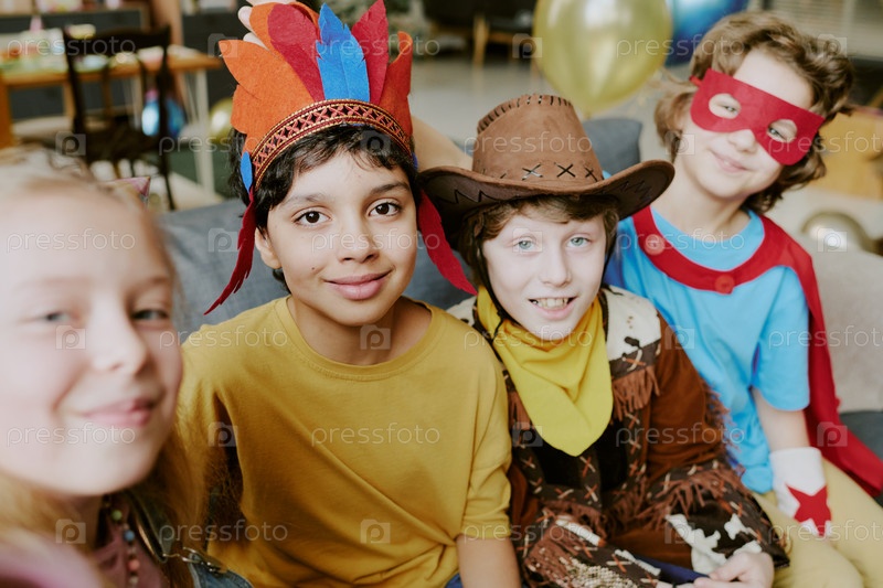 Группа разнообразных детей в костюмах, улыбающихся и позирующих вместе внутри дома