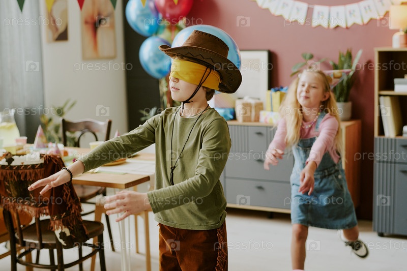 Ношение слепого повязки играет в игру с девочкой на вечеринке со дня рождения мальчика