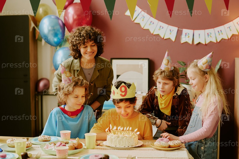 Группа детей празднует день рождения с тортом и свечами в помещении