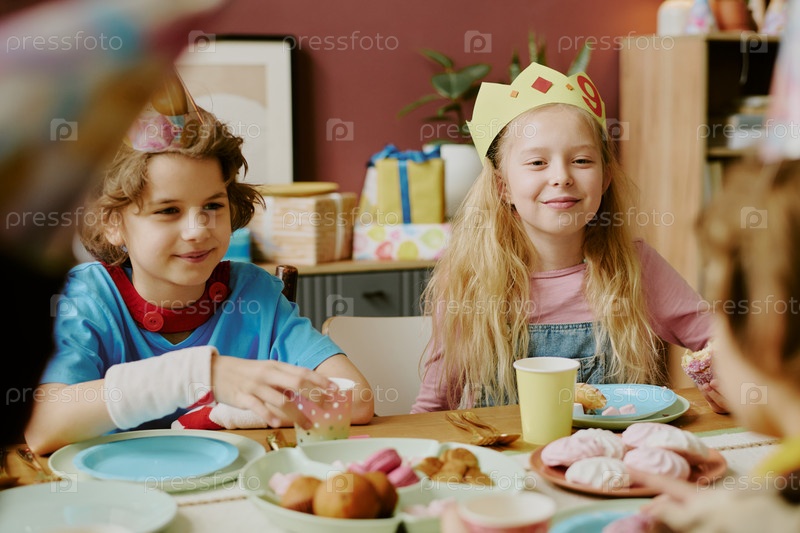 Девочка и мальчик празднуют день рождения с друзьями в помещении