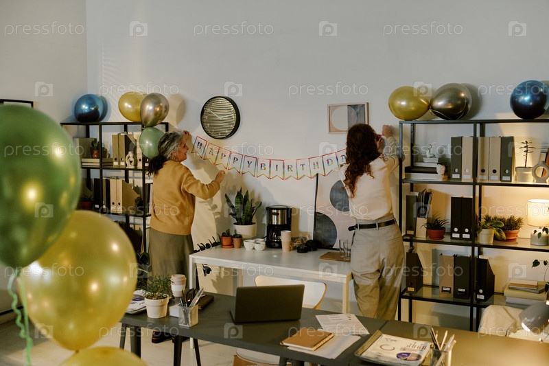 Две молодые взрослые женщины украшают офис для празднования дня рождения