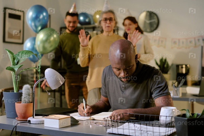 Чернокожий мужчина средних лет работает за столом, в то время как коллеги готовят сюрприз