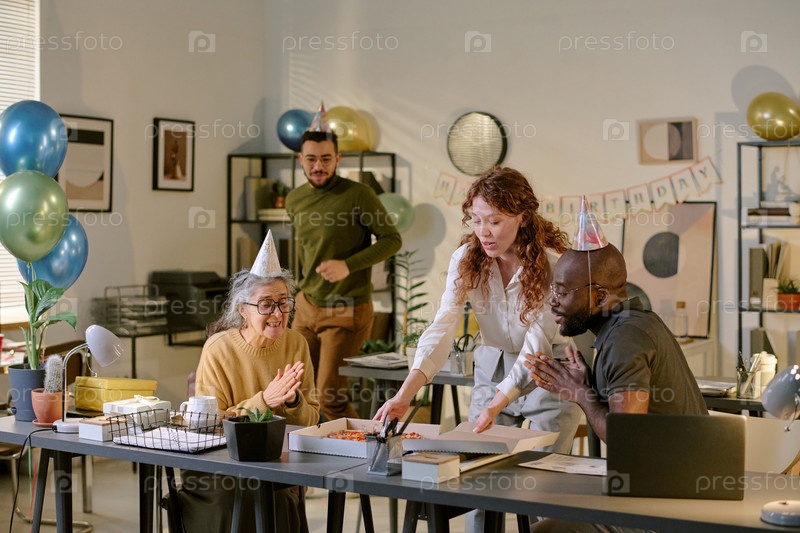 Разнообразная группа коллег празднует день рождения в современной офисной обстановке