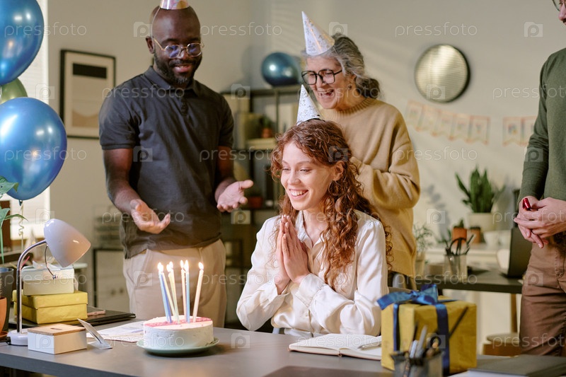 Молодая женщина улыбается во время празднования дня рождения с друзьями в помещении