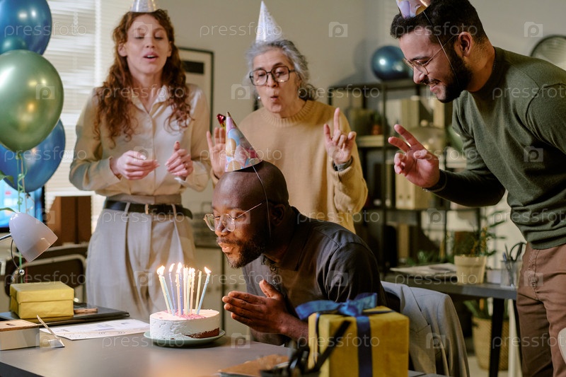 Мультиэтническая группа молодых и взрослых среднего возраста, празднующих день рождения