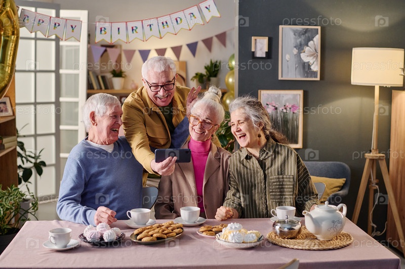 Группа старших друзей улыбаются и делают селфи во время празднования дня рождения