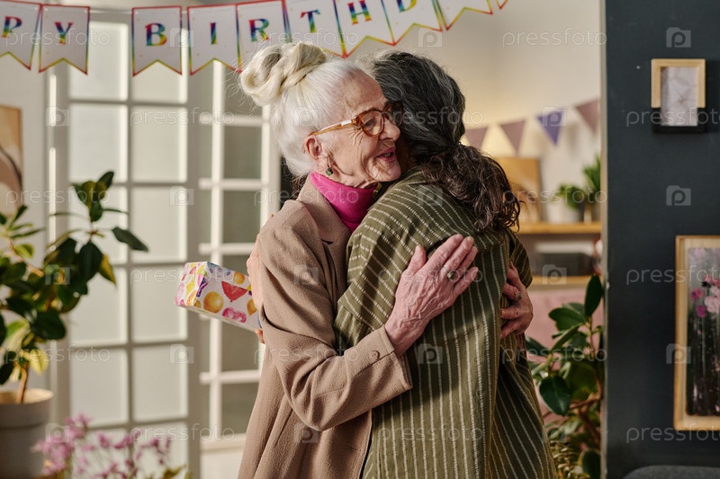 Старшая женщина обнимает женщину среднего возраста во время празднования дня рождения