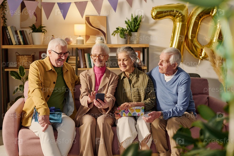 Группа старших друзей, сидящих вместе и празднующих день рождения