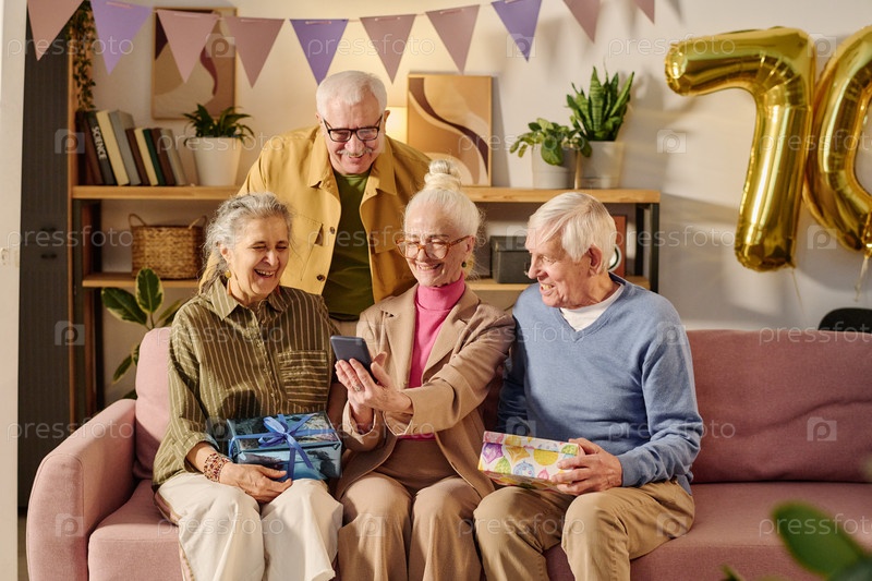Старшие друзья празднуют день рождения и делают селфи вместе