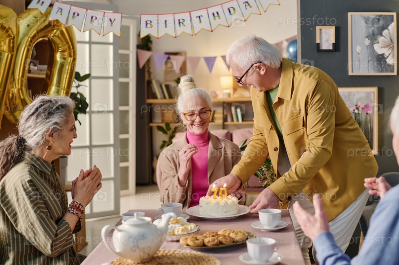 Старшая женщина улыбается, в то время как старший мужчина зажигает рождественский торт