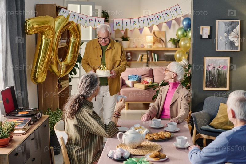 Старший мужчина празднует 70-й день рождения с друзьями в помещении