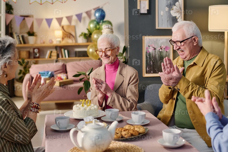 Старшие друзья аплодируют и улыбаются во время празднования дня рождения в помещении