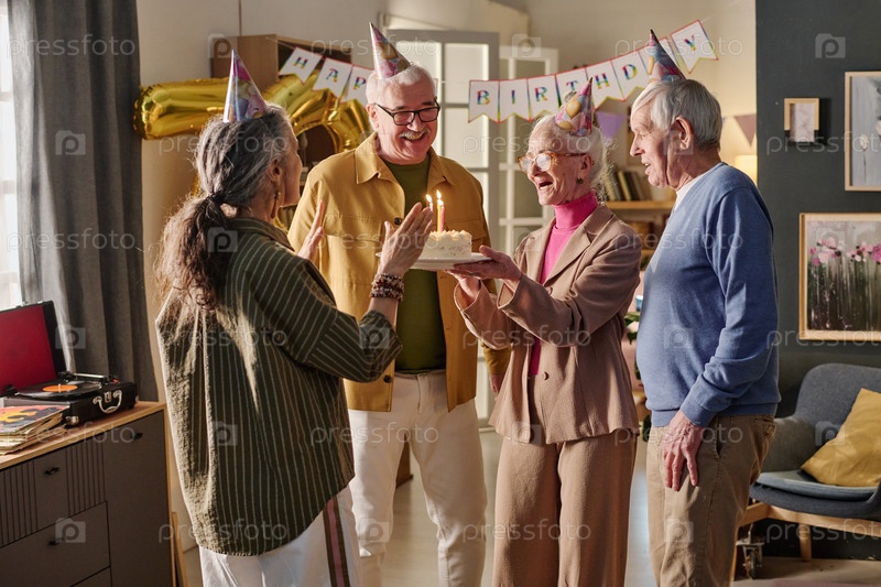 Группа старших друзей, празднующих день рождения в помещении с улыбкой