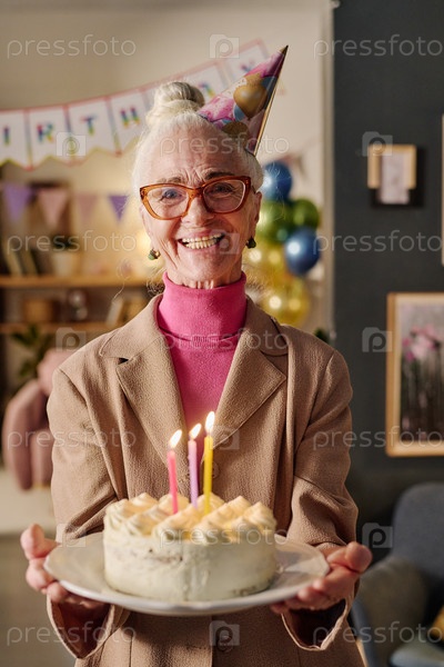 Портрет старшей женщины, улыбающейся во время подачи торта на день рождения