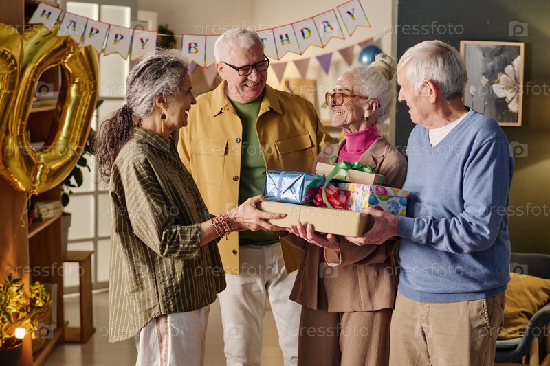 Группа старших друзей, празднующих день рождения и обменивающихся подарками