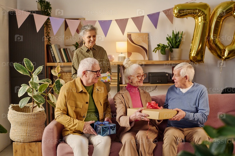 Старшие друзья празднуют день рождения и обмениваются коробками для подарков в помещении
