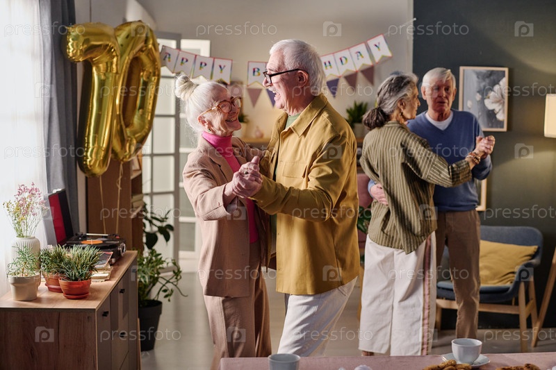 Пожилые пары танцуют вместе, празднуя день рождения в помещении