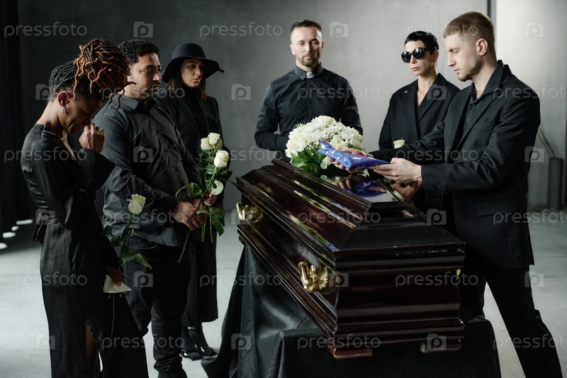 Взрослые молодых и средних лет почтили умерших цветами рядом с деревянным гробом