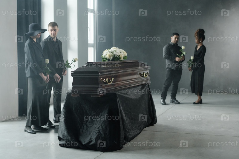 Группа молодых взрослых, скорбящих рядом с гробом во время похоронной церемонии в помещении