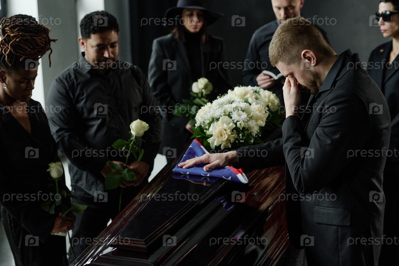 Группа разных взрослых, оплакивающих похороны и скорбящих рядом с гробом