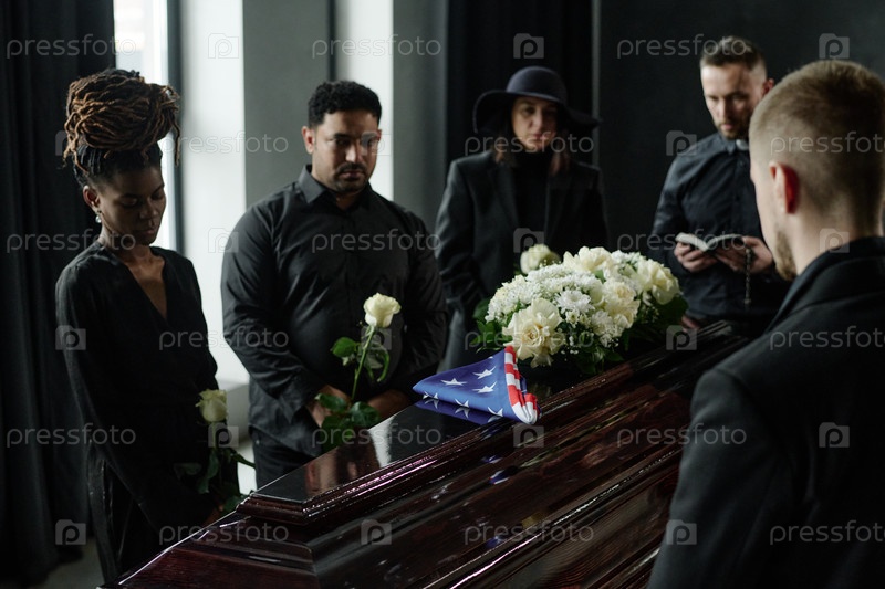 Разнообразная группа скорбит на похоронах, держа цветы возле ковчега с флагом