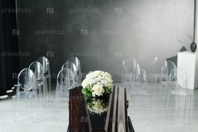 Пустая похоронная часовня с гробом с цветами в ожидании мемориальной службы