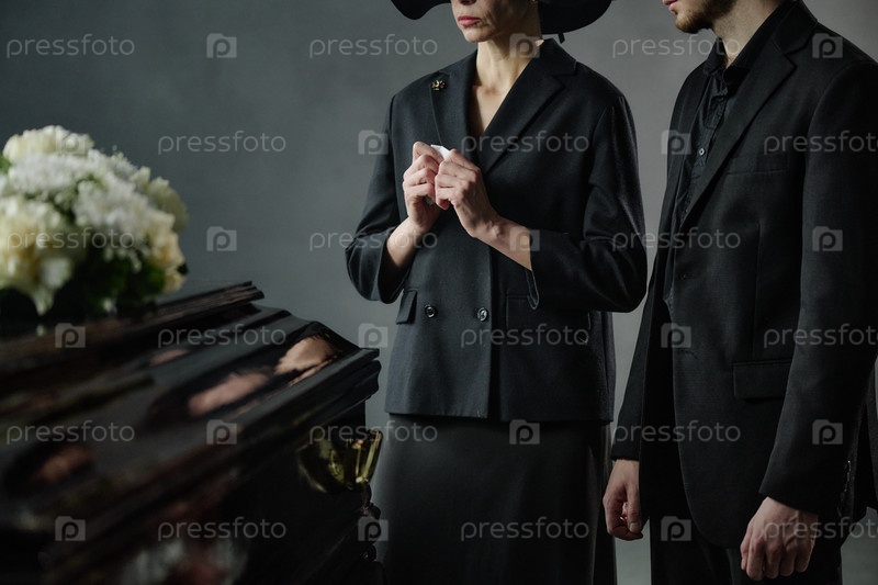 Женщина среднего возраста и молодой взрослый мужчина скорбят рядом с гробом