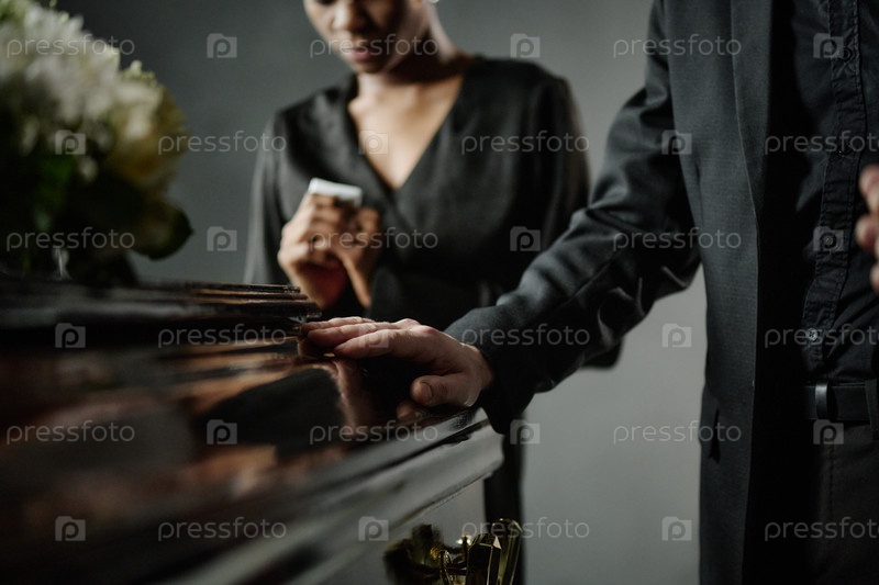 Мужчина средних лет прикасается к гробу рядом с молодой чернокожей женщиной, скорбящей