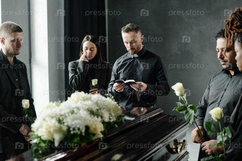 Группа разных взрослых, скорбящих рядом с гробом во время похоронной церемонии