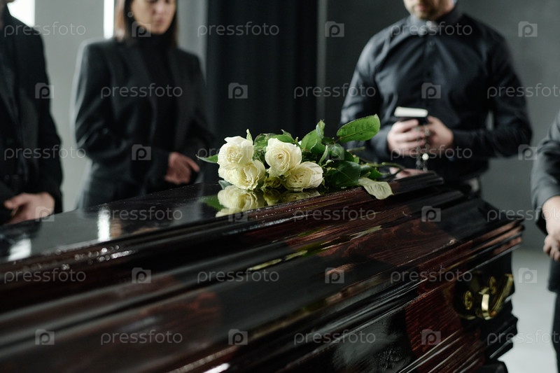 Группа взрослых, скорбящих рядом с гробом во время похоронной церемонии