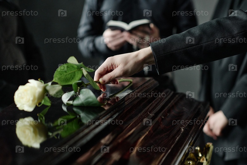 Женщина кладет розу на гроб во время похоронной церемонии в помещении