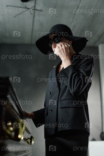 Женщина среднего возраста скорбит рядом с гробом во время похоронной службы