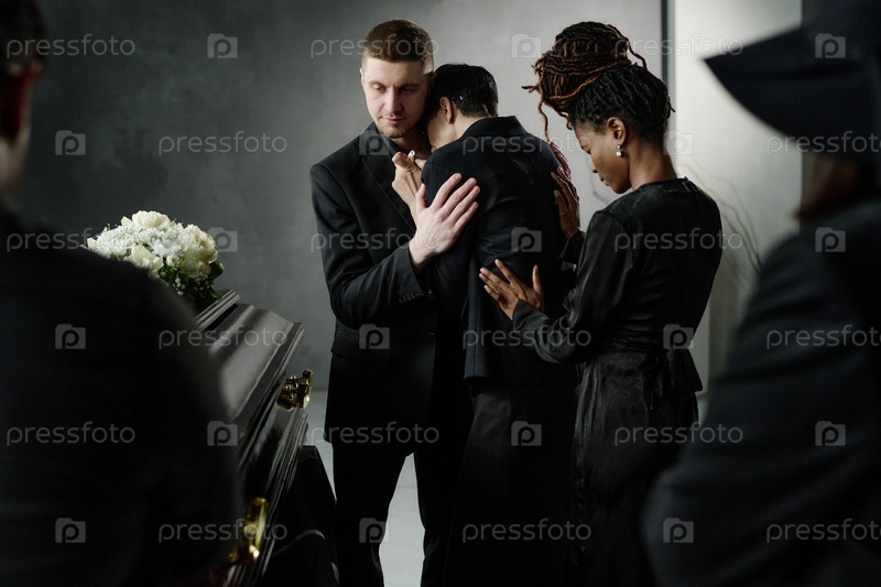 Утешительные скорбящие чернокожие женщины оплакивают рядом с гробом мужчины