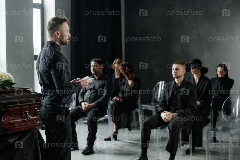 Группа разнообразных взрослых, посещающих похоронную церемонию и слушающих траур