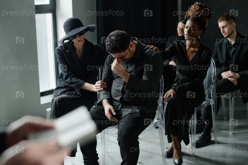 Мультиэтническая группа утешает скорбящего мужчину среднего возраста во время похоронной церемонии