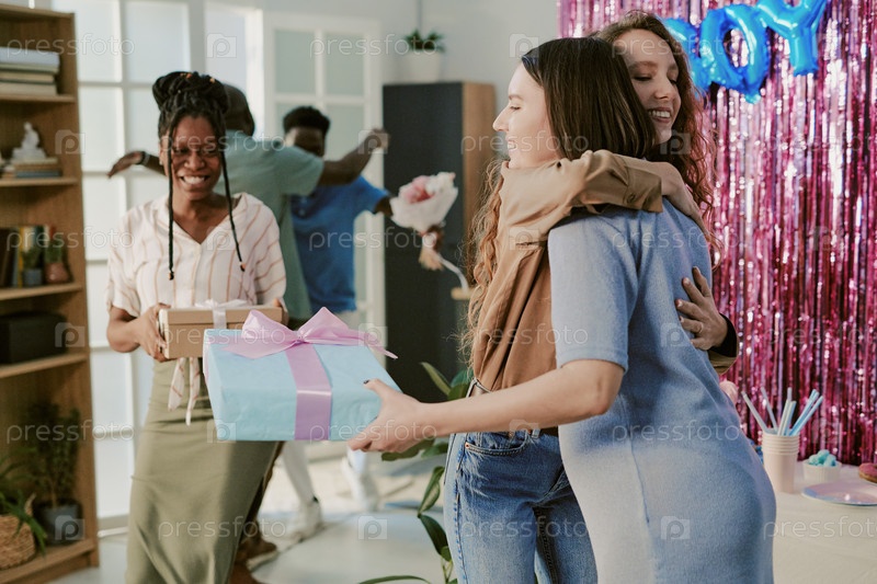 Молодые взрослые женщины обнимаются, в то время как многонациональные друзья приносят подарки на детский душ