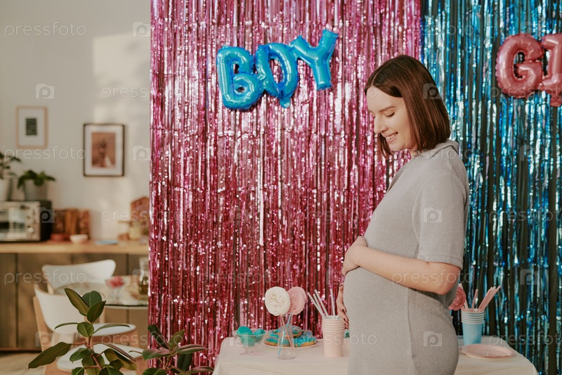Молодая взрослая женщина улыбается во время празднования вечеринки по раскрытию пола