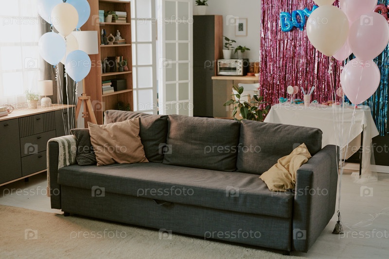 Пустой диван в гостиной Стоящий в декорированной квартире во время детской вечеринки