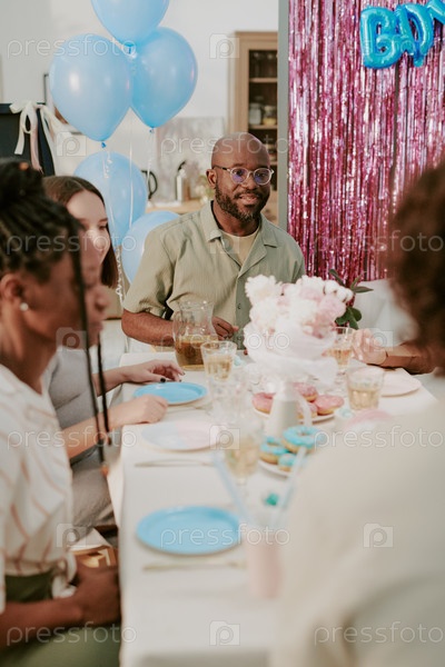 Чернокожий мужчина средних лет празднует детский душ с разнообразной группой за столом