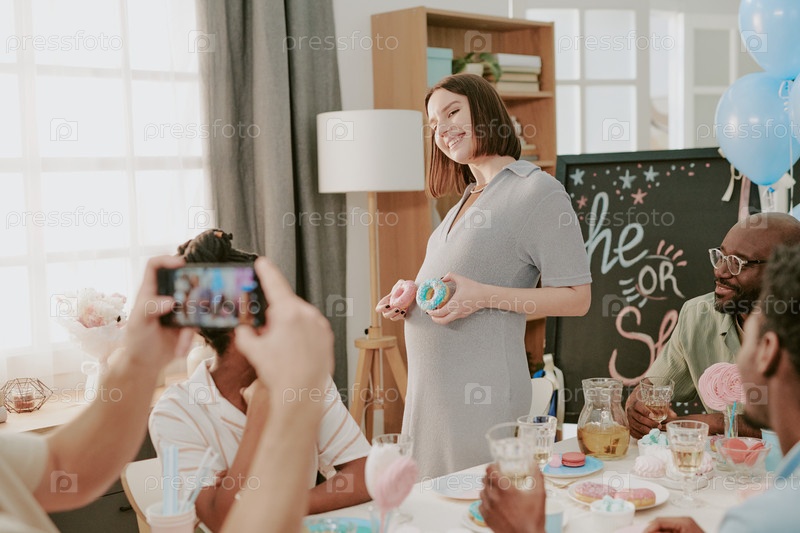 Беременная молодая женщина улыбается, держа в руках кексы на детском душе
