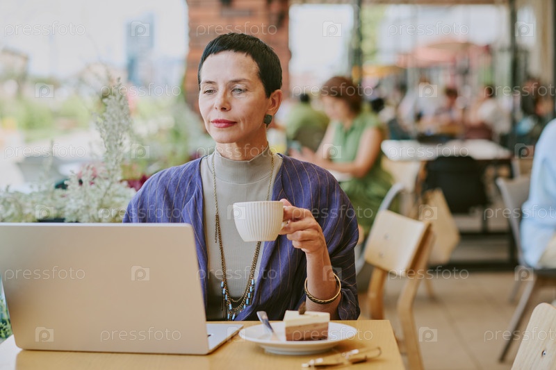 Женщина средних лет работает на ноутбуке, выпивая кофе в помещении