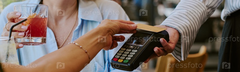 Заголовок с Молодая женщина платит кредитной картой, используя бесконтактный терминал