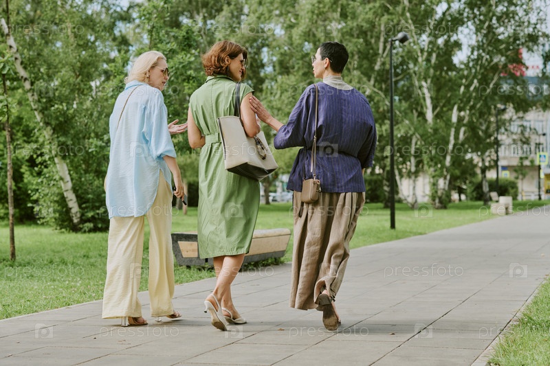 Три молодых взрослых женщины вместе гуляют на открытом воздухе в городском парке