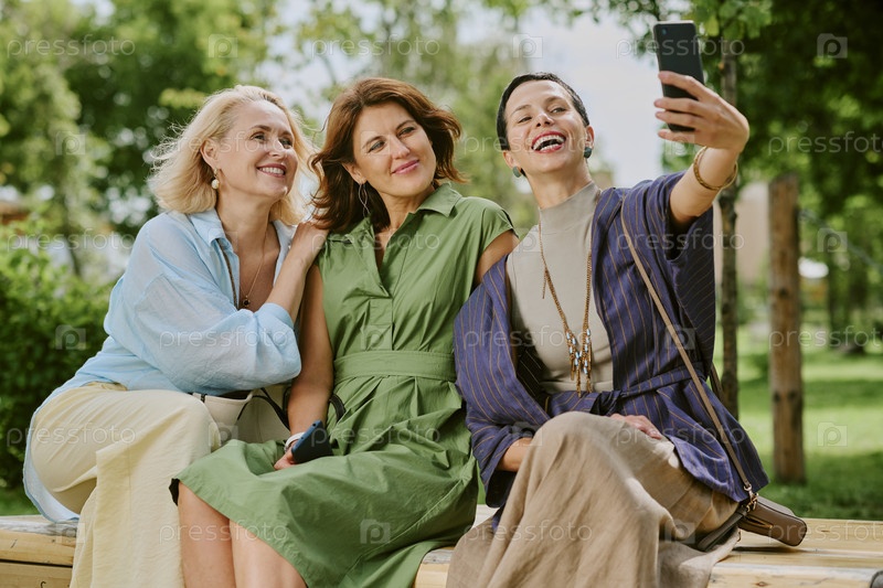 Три женщины среднего возраста улыбаются, делая селфи на свежем воздухе