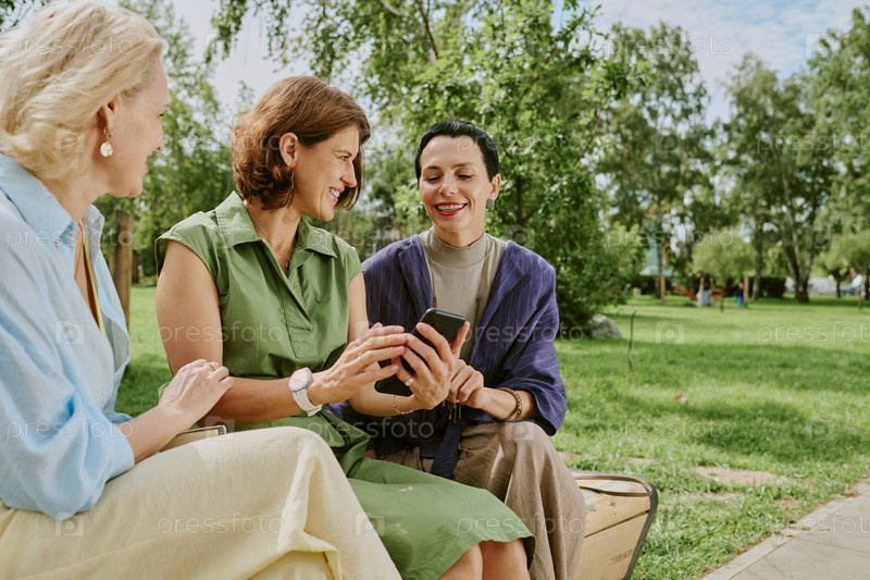 Три женщины среднего возраста сидят на улице, делятся смартфонами и улыбаются