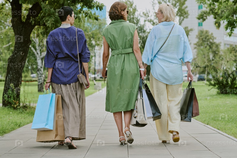 Три женщины среднего возраста, идущие на улице с сумками для покупок