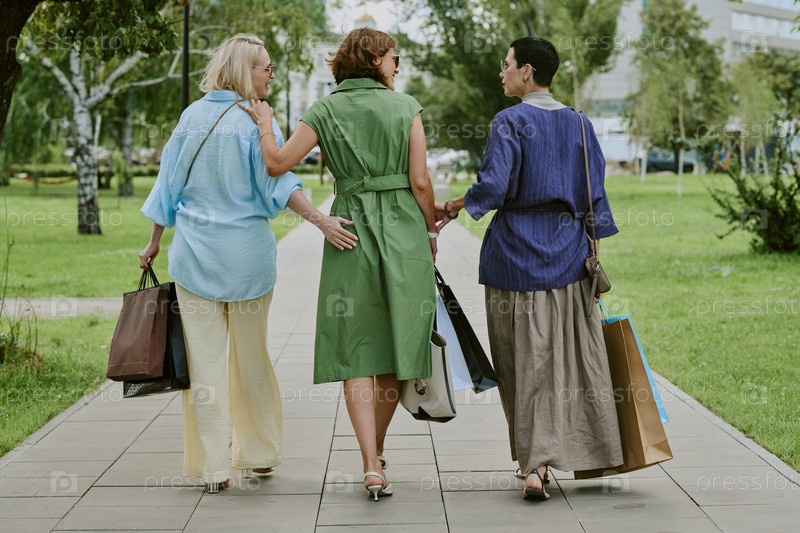 Три женщины среднего возраста, уходящие на улице с сумками для покупок